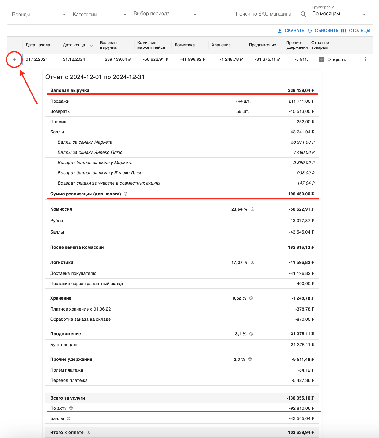 Чтобы найти подробную детализацию в интерфейсе ТОРГСТАТ, перейдите в раздел Мой магазин – Финансовые отчеты – сформируйте отчет, выбрав группировку и период. Самый простой способ подготовить отчет для сверки – выбрать группировку "по месяцам". Далее, нажмите на + в начале нужной строки с отчетом, чтобы развернуть подробную детализацию.
