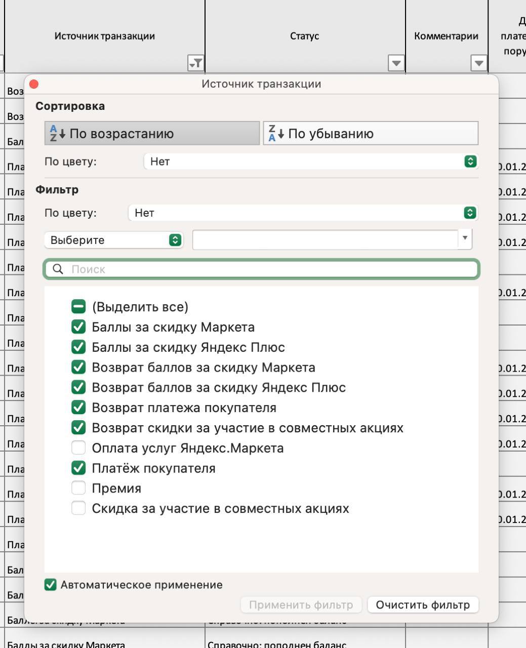 2. Отфильтруйте Источник транзакции, оставив только следующие категории: